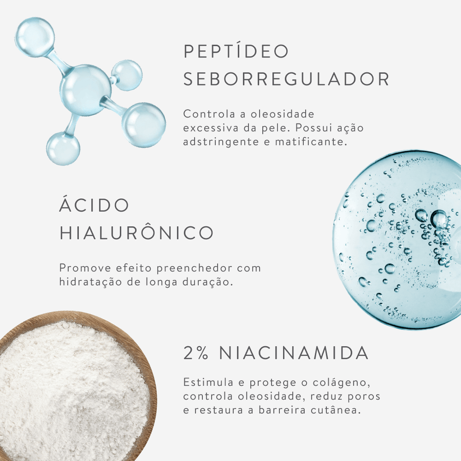 Para o controle de oleosidade prolongado e efetivo, o Protetor Solar Aqua Fluid FPS 50 conta com o Peptídeo Seborregulador em sinergia com Niacinamida, Sílicas e Partículas Antibrilho, regulam a produção excessiva do sebo natural da pele, absorvem a oleosidade e têm ação matificante e antibrilho que disfarça imperfeições.