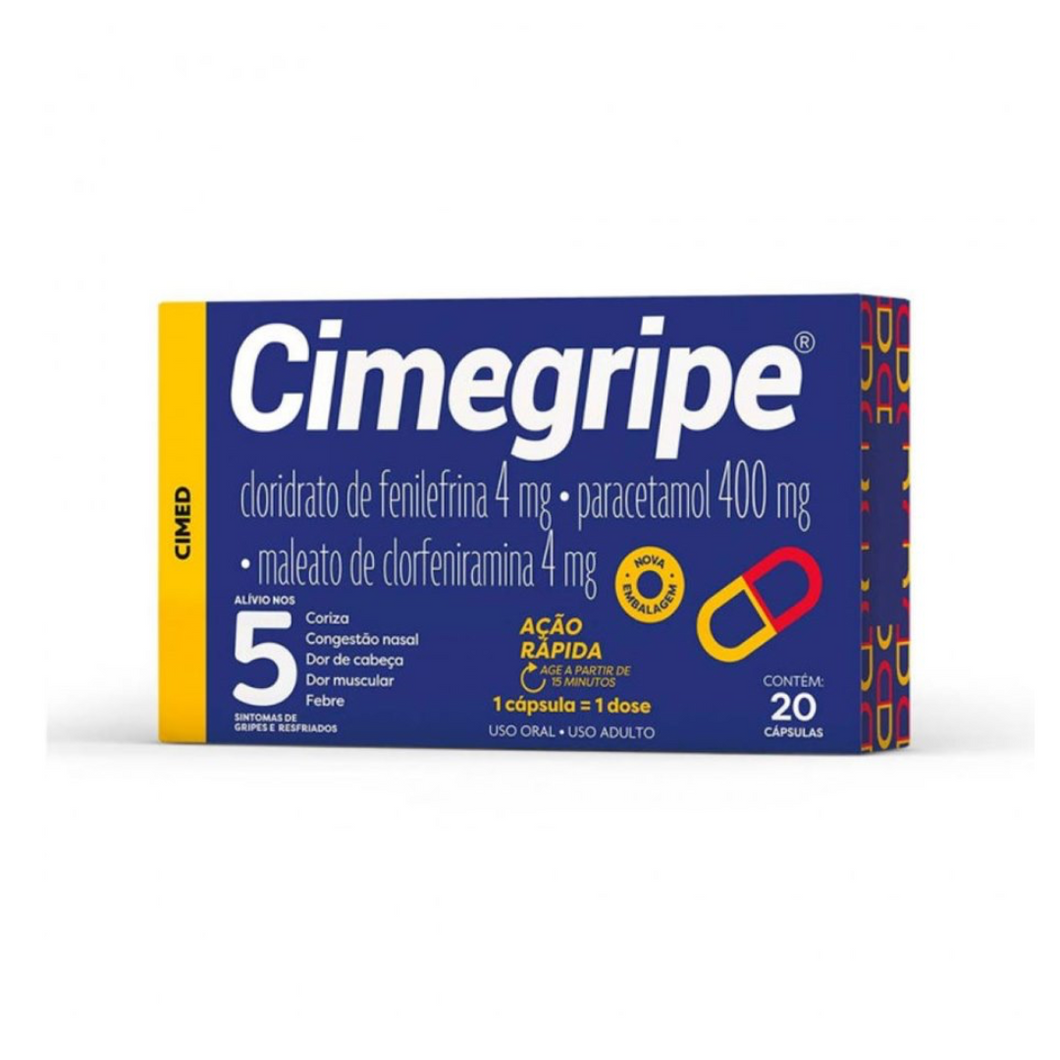 Indicações: Cimegripe é indicado para o tratamento dos sintomas de gripes e resfriados. Cimegripe possui ação múltipla para o alívio da congestão nasal, coriza, febre e dores no corpo presentes nos estados gripais. Uso oral. Uso adulto.