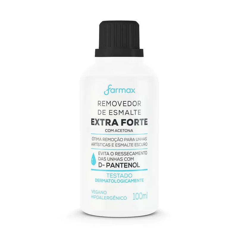 O Removedor Extra Forte Farmax 100ml tem fórmula enriquecida com óleo de girassol e D-Pantenol, que é eficaz na remoção de esmaltes escuros e unhas artísticas.