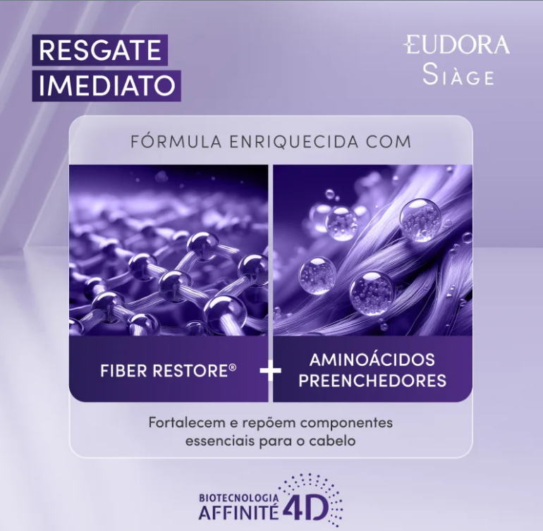 A linha é dedicada para todos os tipos de cabelos, com a exclusiva Biotecnologia Affinité 4D e ativos pensados para reconstruir seus fios, Resgate Imediato Eudora traz benefícios comprovados¹: