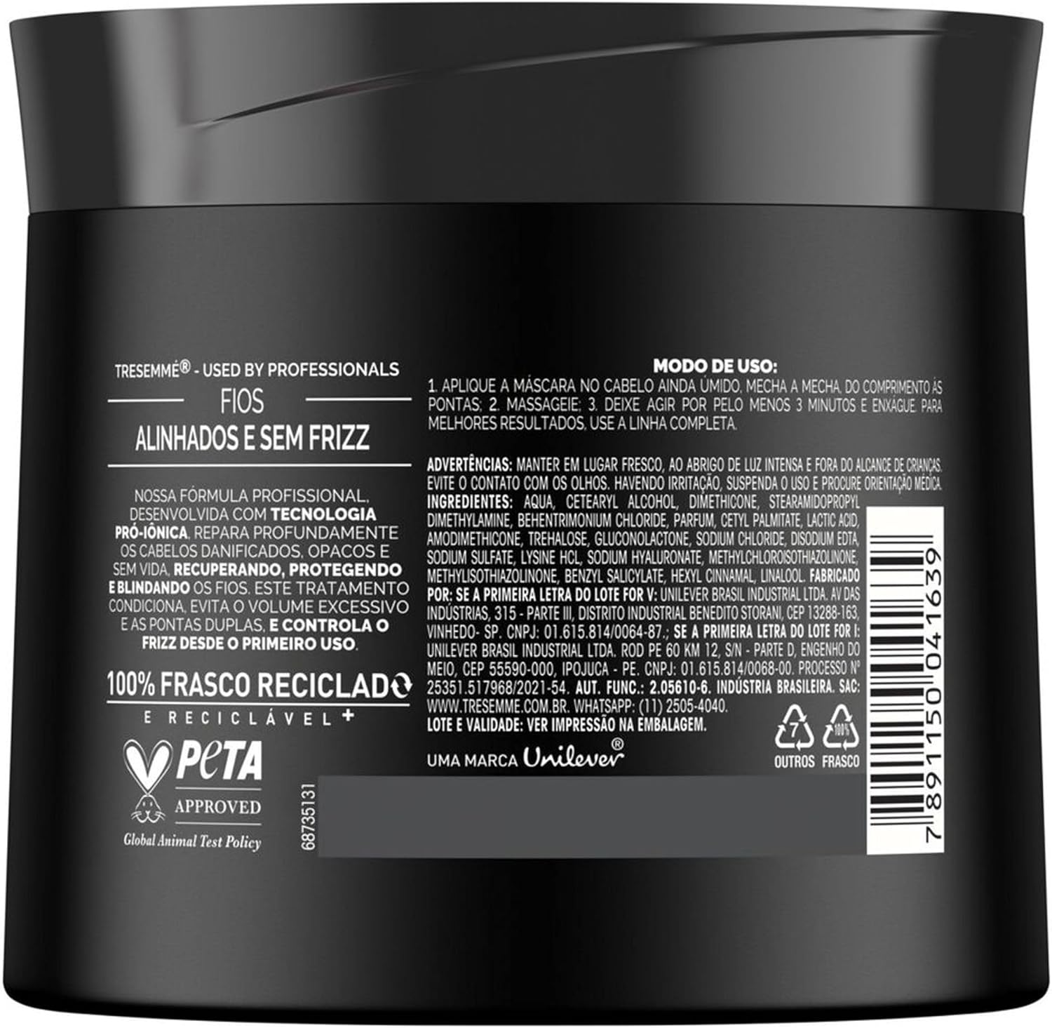 A Máscara de Tratamento TRESemmé Blindagem Antifrizz possui fórmula profissional desenvolvida com Tecnologia PRÓ-IÔNICA, que neutraliza as cargas negativas dos cabelos, eliminando imediatamente o frizz e devolvendo seu alinhamento, maciez e maleabilidade aos fios. Cabelos reparados, blindados e livres de frizz.